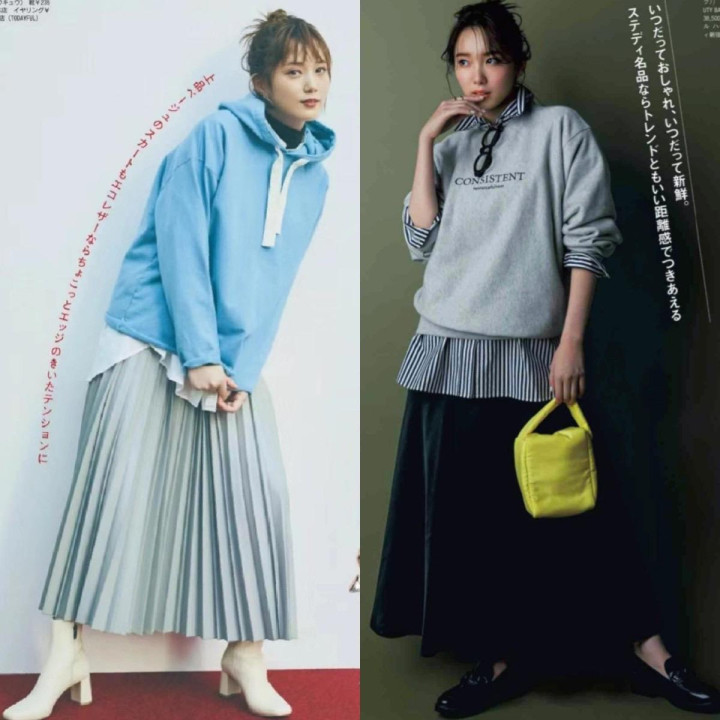 小个子想要分割身材比例,不要一味的“塞衣角”,要学会巧用版型和色彩,划分黄金比例。长度不过跨的基础色卫衣,搭配对比色过膝长裙,像这种“上短下长”的穿法,就能让身材比例更协调。