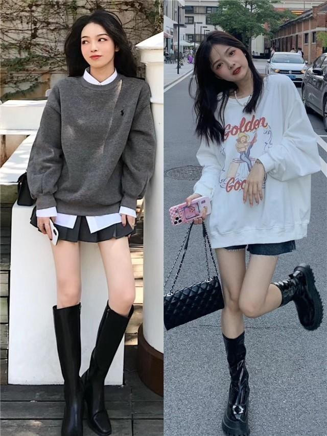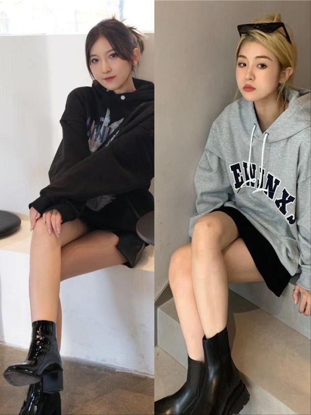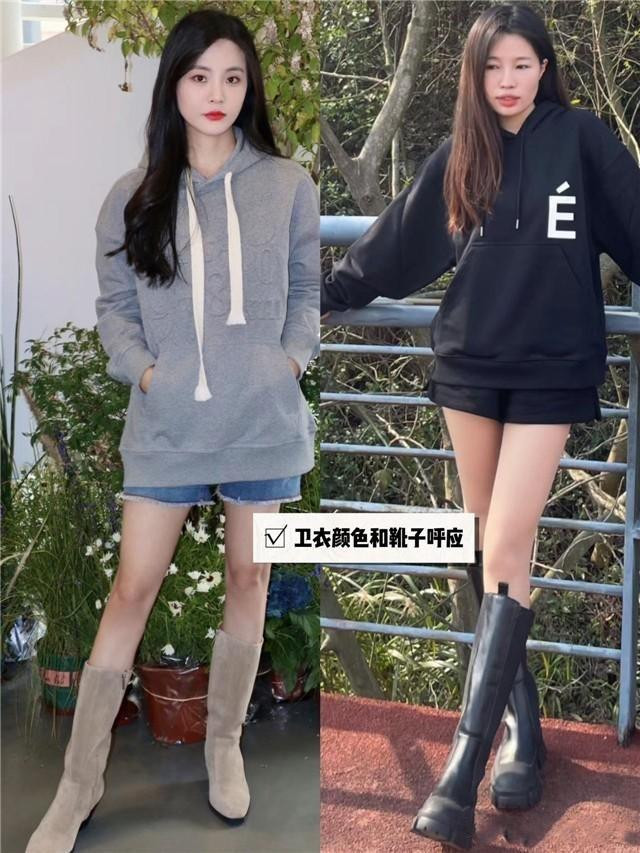 穿衣打扮讲究一个协调感,对于小个子来说,像这种遮臀长度的微宽松卫衣,就很适合搭配短裤短裙,靴子选择贴合度比较高的高筒靴,修饰腿部曲线,视觉上显瘦又显腿长。