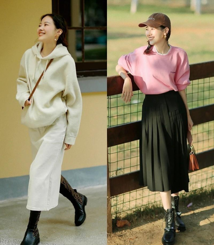 穿搭是很有魔力的,尤其是面对卫衣这种休闲单品,想要穿出精致时髦的效果,就不能用太常规的穿法,一味地配牛仔裤、运动鞋,只会显得路人感十足,换成半身裙和靴子,才能美的毫不费力~